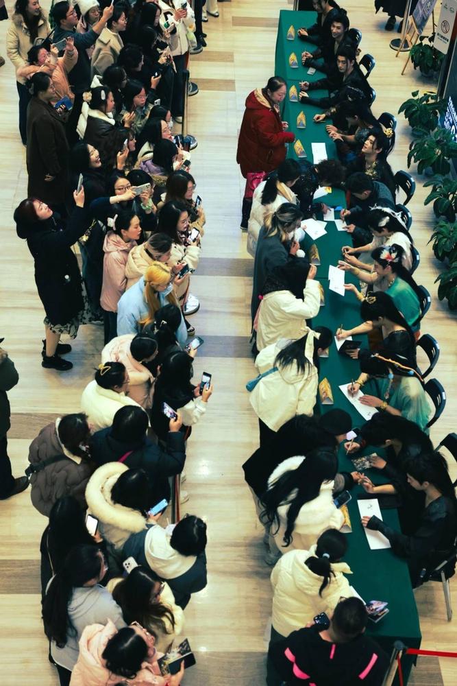 观众排队签名 《翎衣》这个剧名听起来有些偏僻,其实“翎衣”指的是羽毛做成的华丽衣服,也是指仙人的法衣,“翎衣”这个词也是从古代神话中就有应用,从剧名到整体舞台呈现都带有“仙侠味儿”,网感呼之欲出。